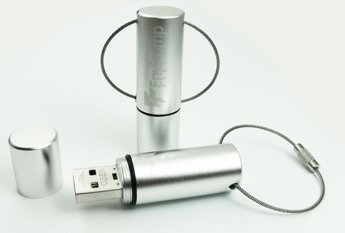 Raffinesse bei USB Sticks hinzugekommen.Erforderlich war es bei dem runden USB Stick von Envocomp. Der Anschluss war besonders lang gehalten. Außerdem musste gekennzeichnet werden wo oben ist und wie man den Stick anschließen musste. Die technischen Geräte machten dies erforderlich.